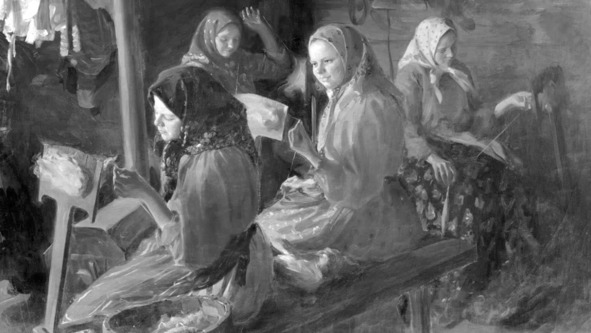 Де́вицы приходят с пряхами, прядут белое льняное волокно – куде́лю. Мать, отпуская Аннушку на беседку, наказывала, сколь надо ниток напрясть. Аннушка вместе с другими девушками прилежно работает, стараясь выполнить урок3, а то, вдруго́рядь4, не отпустит матушка на беседку. Девушки тихо разговаривают, заунывно и мирно поют протяжные песни. А когда наскучит, запоют песню-прибаутку: