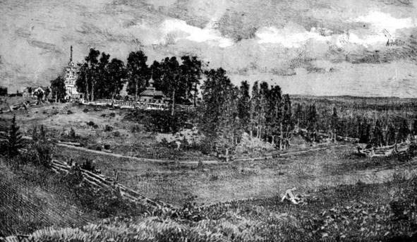 Слушали паломницы21бывальщину, а сами шли, озираясь кругом, через непроходимый лес по чуть заметной тропке. Сумрачно под сводами исполинских елей, жутко. Иной раз на окрайке леса след косолапого22 или сохатого23 встретится. Но вот, в глубине чащи заметила глазастая Аннушка маленькую иконку. Дальше еще одну. На ветвях деревьев висели белые лендочки24-лоскутки, указывающие путь к Святой горе. Так, с Божьей помощью, добрались судиловские бабы-солдатки до святого места.