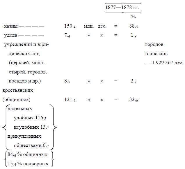 У казны из ее земель 69.3 % леса (100 млн. дес. в Архангельской, Вологодской, Олонецкой и Пермской губерниях). 28.1 % неудобной земли и 2.6 % удобные {менее 4 млн. дес.}