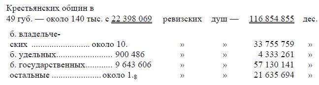Три северные губернии (Архангельская, Олонецкая, Вологодская) принадлежат почти целиком казне (97, 93 и 83 % пространства губерний). 2 восточные (Пермская и Вятская) – наполовину (51 и 48 %). В этих пяти губерниях 1337 г млн. дес. казенной земли (= 881/2 % государственных земель).