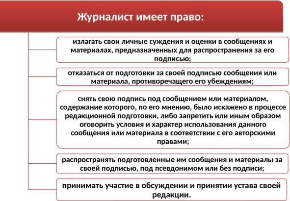 Закон о СМИ приводит обширный набор прав журналиста, объединённых в статье 47. Их можно распределить по критерию содержания на две группы: 1) внутриредакционные права журналистов; 2) права, связанные с поиском, получением и распространением информации.