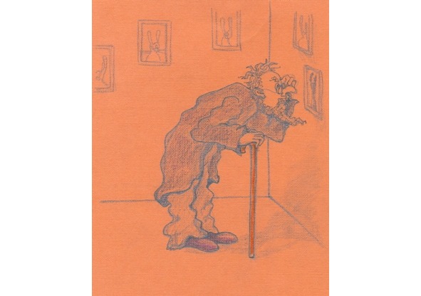 Немного времени прошло, и в комнату вошел старикашка. Он пить из чашки не стал (к тому же, она была пуста), а стал расхаживать вдоль стен комнаты и разглядывать висевшие на них картинки. Ворча и кряхтя, он останавливался возле каждой картинки и ругался, и плевался… По всему видно было, что эти картинки ему совсем не нравятся. Так он обошел всю комнату и с чрезвычайно недовольным видом пошел из комнаты на улицу. А Некто в синем тоже скорей побежал на улицу следом за старикашкой и закричал ему вдогонку: