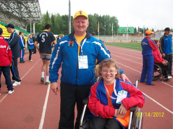 После завтрака в приподнятом настроении мы все отправились на стадион «Югра-Атлетикс», здесь проходили соревнования по легкой атлетике. В этот день я впервые толкнула ядро, надо сказать, произошло это очень забавно и позитивно. Дело в том, что на станок спортсменов садил тренер по легкой атлетике – Кунаков Константин Юрьевич. И вот пришла моя очередь, я говорю ему: «Как же мне вас приобнять, чтобы вам было удобнее меня посадить на станок?» На что Константин Юрьевич мне ответил: «Конечно, как же главного судью то не обнять.» На тот момент я не знала, что он – главный судья соревнований. Мы оба посмеялись. Сейчас мы с Константином Юрьевичем большие друзья, он так же меня тренирует, делится своим опытом. Мне приятно с ним работать. Он – добрый, отзывчивый, понимающий человек, я считаю, для тренера это одни из самых важных качеств.