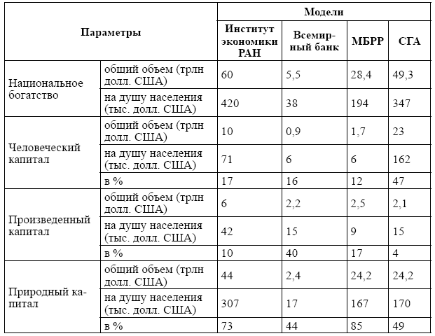Оценки национального богатства России и его структурных составляющих, выполненные по различным моделям