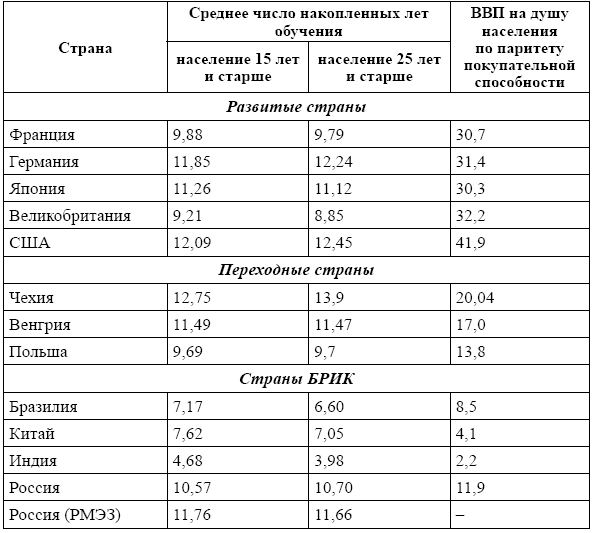 Данные табл. 11 говорят о том, что по среднему числу лет накопленного образования Россия находится в числе мировых лидеров, резко выделяясь среди стран с развивающейся экономикой.