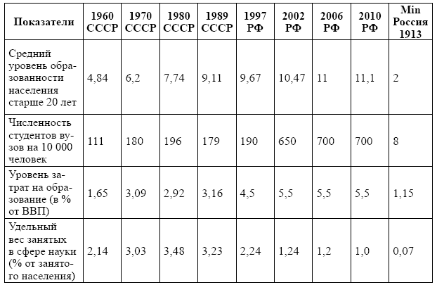 Обнаруженные В. К. Левашовым закономерности в развитии и накоплении человеческого капитала в России можно проследить по данным табл. 12. Инвестирование в человеческий капитал, отмечает ученый, является одним из важных направлений деятельности государства. В нашей стране увеличивается количество граждан, желающих получить и получающих высшее образование. Россия продолжает в широких масштабах (при всех недостатках современной системы высшего образования) больше, чем в других странах (в расчете на 10 000 чел.) готовить специалистов высшей квалификации[106].