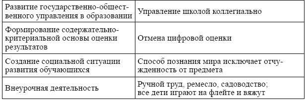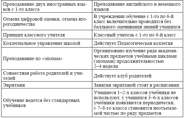 Подробное рассмотрение педагогических разработок Московской вальдорфской школы не входит в рамки нашего исследования, интересен сам факт творческого отношения к вальдорфской традиции и процесс трансформации вальдорфского феномена в современных российских условиях, имеющий своей целью добиться соответствия уровня вальдорфского образования и уровня общего среднего образования в России, а также добиться соответствия вальдорфской педагогики современным подходам к сущности и приоритетам воспитания и образования личности (см. табл. 16).