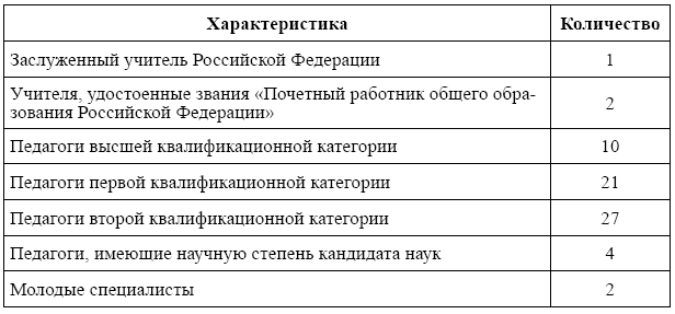 В настоящее время в школе имеется 11 классов. В ней обучается 350 детей. Дифференциация обучения начинается с 8-го класса. Средняя численность классов 25 человек. В школе ведется преподавание двух иностранных языков, начиная с 1 – го класса. Всего в школе трудятся 62 педагога. В ней накоплен значительный человеческий капитал педагогического коллектива. Об этом свидетельствуют приведенные ниже данные (табл. 15).