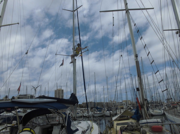 На всякий случай я заказал одну запасную нижнюю ванту, так как уже дважды, в 2012-м, после израильского похода, и в 2014-м, во время перехода из Турции на Сицилию, мне приходилось заменять поврежденные ванты по правому борту. Монтажные пояса, что я купил в «Восток-сервисе», никуда не годились. На весу в них совершенно невозможно работать. Они так сдавливали мои ломаные ребра, что просто невозможно было вздохнуть. С большим трудом мне удалось снять одну ванту, чтобы отнести в мастерскую и заказать две новых. Хорошо, рядом с нами стояли англичане, Рой и Кэролайн. Накануне я видел, как Рой поднимался на мачту при помощи альпинистского снаряжения. Когда мы получили готовые ванты, я попросил у них снаряжение и сравнительно легко управился со снятием второй поврежденной ванты и установкой двух новых. А на следующий день Рой с Кэролайн отвели меня в альпинистский магазин и помогли подобрать мне снарягу для меня. Теперь я могу подниматься на мачту даже без посторонней помощи. Очень интересно было поболтать с Кэролайн, она заметила, что мой английский неплох и улучшается с каждым днем. Рой сказал, что не участвует в любительских регатах, потому-что там много неопытных шкиперов и жалко повредить лодку. А сам он несколько раз уже пересекал Атлантику, что-то больше двадцати раз.
