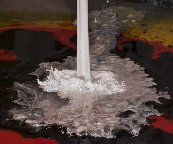 [2] Джулио М. Оттино – профессор химической технологии, доцент химии и технологии полимеров Массачусетского университета в Амхерсте. Окончил Национальный университет Ла-Плата в Аргентине и Миннесотский университет в США, где в 1979 году получил степень доктора философии. Проводимые Оттино исследования процесса перемешивания цветных материалов не ограничиваются лабораторией. Он сам рисует, его работы были представлены на персональной выставке в Аргентине. Недавно Оттино дописал книгу «The Kinematics of Mixing: Stretching, Chaosand Transport», которая будет издана издательством «Cambridge University Press». [3] Ламина́рное тече́ние (лат. lāmina – «пластинка») – течение, при котором жидкость или газ перемещается слоями без перемешивания и пульсаций (то есть беспорядочных быстрых изменений скорости и давления). Только в ламинарном режиме возможно получение точных решений уравнения движения жидкости (уравнений Навье – Стокса), например течение Пуазейля. Ламинарное течение возможно только до некоторого критического значения числа Рейнольдса, после которого оно переходит в турбулентное. Число, или, правильнее, критерий Рейно́льдса (Reкр) – безразмерная величина, характеризующая отношение нелинейного и диссипативного членов в уравнении Навье – Стокса. Число Рейнольдса также считается критерием подобия течения вязкой жидкости. Для каждого вида течения существует критическое число Рейнольдса, которое, как принято считать, определяет переход от ламинарного течения к турбулентному. [4] Турбуле́нтность, устар. турбуле́нция (от лат. turbulentus – бурный, беспорядочный), турбуле́нтное тече́ние – явление, заключающееся в том, что при увеличении скорости течения жидкости или газа в среде самопроизвольно образуются многочисленные нелинейные фрактальные волны и обычные, линейные различных размеров, без наличия внешних, случайных, возмущающих среду сил и/или при их присутствии. Для расчета подобных течений были созданы различные модели турбулентности. Волны появляются случайно. То есть их размер и амплитуда меняется хаотически в некотором интервале. Они возникают чаще всего либо на границе, у стенки, и/или при разрушении или опрокидывании волны. Они могут образоваться на струях. Экспериментально ее можно наблюдать на конце струи пара из электрочайника. Турбулентность экспериментально открыта английским инженером Рейнольдсом в 1883 году при изучении течения несжимаемой жидкости (воды) в трубах.