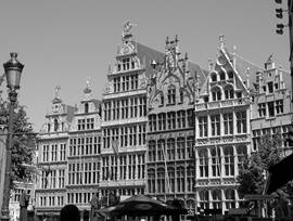 Площадь окружена кирпичными домами гильдий 16-17 в. с фигурными фронтонами, фасады которых сплошь покрыты огромными четырехчастными высокими окнами так, что сама стена за ними практически теряется, этажи разделены выступающими карнизами. В центре площади стоит фонтан Брабо, напоминающий о герое, победившем великана Антигона.