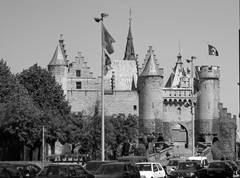 Замок графов Фландрских, одно из самых значительных сооружений Гента, занимает очень выгодное стратегическое положение на острове при слиянии рек Шельды и Лайе. Он окружен овальной в плане стеной с равномерно стоящими прямоугольными контрфорсами, в которые здесь трансформировались башни, завершающимися площадками, окруженными зубчатыми парапетами. Часть стен выступает прямо из воды, затрудняя возможным захватчикам приступ замка. Мощная прямоугольная башня охраняет ворота, ведущие внутрь. Внутренний двор занимает большое здание дворца с плоской крышей, окруженной зубцами, укрепленное по углам навесными круглыми башнями. Берега вокруг замка застроены бюргерскими домами из красного кирпича.
