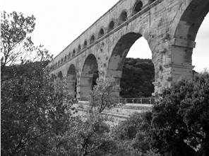Пон-дю-Гар. Римляне очень заботились о водоснабжении своих городов. Вода из крупных источников перебрасывалась в более засушливые местности по специальным сооружениям – акведукам. Самый грандиозный и наиболее хорошо сохранившийся римский акведук стоит недалеко от Нима. Пон-дю-Гар был перекинут через реку Гар в 1 в. Это трехъярусное сооружение, длина которого составляла 50 км, строилось с 40 по 60 г.г. для доставки воды в город Ним.