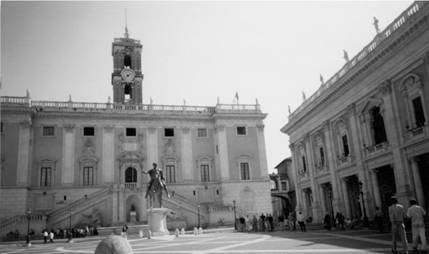 На вершине Капитолийского холма, одного из семи холмов Рима, раскинулась Капитолийская площадь необычной трапециевидной формы. Проект площади и перестройки ее средневековых дворцов, дворца Сенаторов и дворца Консерваторов, принадлежат Микеланджело. Площадь расширяется по направлению от ведущей к ней снизу лестницы к сенаторскому дворцу, являющемуся доминантой ансамбля благодаря своей квадратной двухъярусной башне с часами, что создает оптический эффект, зрительно увеличивающий размеры дворца и еще более подчеркивающий его центральную роль во всей композиции.