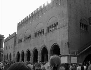 За площадью скрыты остатки замка Малатесты с мощными стенами из красного кирпича, укрепленными каменными контрфорсами, соединяющими прямоугольные башни с плоскими крышами и машикулями – символ могущества истинных правителей города, прячущихся в тени показной власти городского собрания в палаццо дель Подеста.