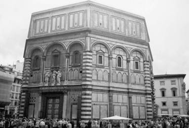 Древний восьмигранный Баптистерий был построен в 8 в. в романском стиле на месте языческого храма. Позднее перестраивавшийся, он был предназначен специально для крещения, так как некрещеным запрещалось входить в собор, стоящий по соседству. Это одно из старейших зданий города, славящееся своими великолепными бронзовыми позолоченными дверями с барельефами, являющимися впечатляющими произведениями средневекового искусства. Трехъярусное здание под остроконечной крышей облицовано, как и соседний собор, белым и зеленым мрамором, углы восьмигранника выделены рустованными пилястрами, полуколонны из зеленого мрамора делят каждую грань на три части, завершающиеся полукруглыми арками с расположенным в них окном с треугольным фронтоном. В интерьере баптистерия особенно интересны установленные в нижнем ярусе стен свободно стоящие колонны из порфира, следующие ордерным классическим традициям, они явились предвестником скорого наступления ренессанса.
