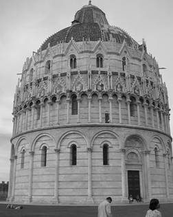 Баптистерий был заложен в 1153 г. архитектором Диатисальви, затем над ним работали Никколо и Джованни Пизано. Строительство его было завершено лишь в 14 в. Круглая в плане беломраморная постройка увенчана полукруглым куполом с фонарем, а нижний этаж декорирован глухой полукруглой аркадой. Верхние ярусы опоясывает изящная колоннада с ажурными треугольными фронтонами, разделенными пилястрами, над ними расположены полукруглые окна, а венчают стену стрельчатые ажурные фронтоны, выступающие над карнизом здания. В центре интерьера, по периметру которого проходит колоннада, расположен восьмиугольный бассейн для крещения, возле входа – каменная кафедра работы Никколо Пизано, первый образец готического искусства в Италии, с барельефами, представляющими жизнь Христа.