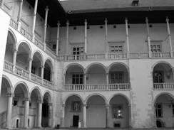 Трехэтажный королевский замок скрывает пятиугольный обширный внутренний двор, ренессансное изящество которого подчеркивают опоясывающие его открытые галереи с полукруглыми арками.