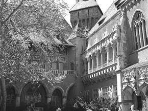 На берегу пруда, будто по мановению волшебной палочки, вырастает укрепленная контрфорсами и покрытая четырехскатной высокой крышей стена замка Вайдохуняд с 2 живописными квадратными башнями – одна с крышей со шпилем в окружении маленьких башенок, другая в виде двух усеченных пирамид. Во внутренний двор открывается покрытая каменным кружевом двухъярусная арочная галерея, являя собой яркий образец «пламенеющей готики». Треугольный фронтон фасада церкви св. Дьердя со статуарными нишами и перспективным порталом фланкирован двумя квадратными башнями, а над средокрестием высится башня с аркадой звона под двухскатной крышей.