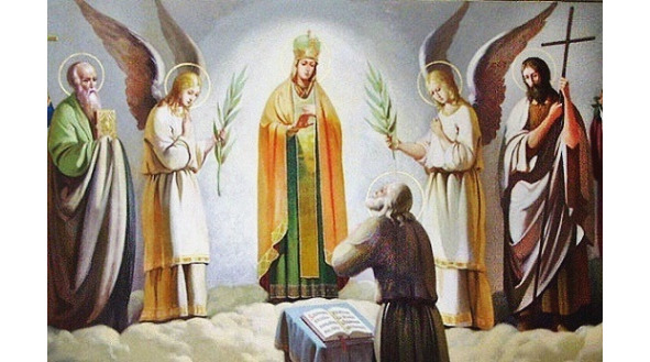 В келию вступили два Ангела с ветвями в руках, за ними Сама Богородица, двенадцать дев, потом святые Иоанн Предтеча и Иоанн Богослов. Царица Небесная имела на себе мантию блестящую, несказанной красоты. На голове была корона, чудная, сиявшая таким светом, что нельзя было смотреть глазами, равно как и на Самое Лицо Царицы Небесной. Батюшка Серафим стоял пред Нею, и говорила Она столь милостиво, как бы с родным человеком. ЧС