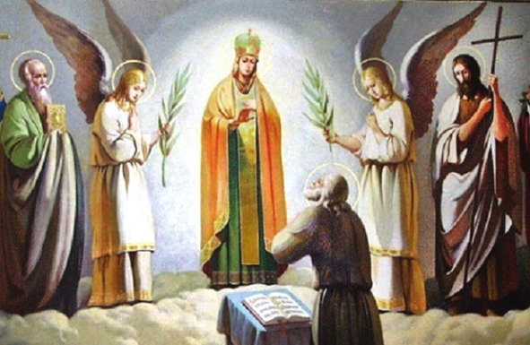 В келию вступили два Ангела с ветвями в руках, за ними Сама Богородица, двенадцать дев, потом св. Иоанн Предтеча и Иоанн Богослов.