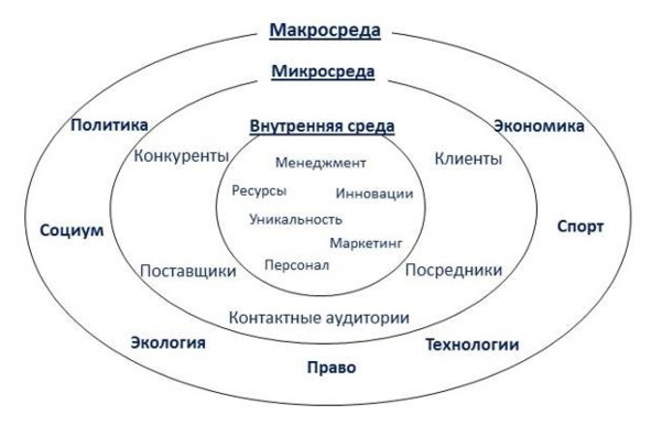 Успешное достижение цели потребует более четкой ее формулировки, что невозможно при отсутствии полной информации об амбициях и возможностях спортивной организации, а также факторах, способных повлиять на ее движение к цели. Все эти задачи можно решить, проведя тщательный анализ внутренней и внешней (маркетинговой) среды. Внешняя среда, в свою очередь, состоит из ближайшего окружения объекта маркетинга (микросреды) и факторов более широкого влияния (макросреды).