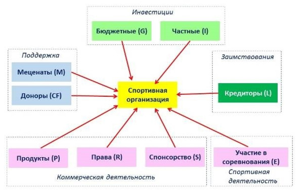 Российская нормативно-правовая база регулирует отношения хозяйствующих субъектов в спорте, отдельно определяя в качестве основных источников доходов некоммерческих физкультурно-спортивных организаций регулярные и единовременные поступления от учредителей (участников, членов); добровольные имущественные взносы и пожертвования; выручка от реализации товаров, работ, услуг; дивиденды (доходы, проценты), получаемые по акциям, облигациям, другим ценным бумагам и вкладам; доходы, получаемые от собственности некоммерческой организации; другие не запрещенные законом поступления31.