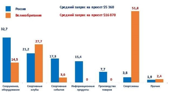 Рис. 3.6. Приоритеты краудфандинга спортивных проектов в России и Великобритании (2015 г.)