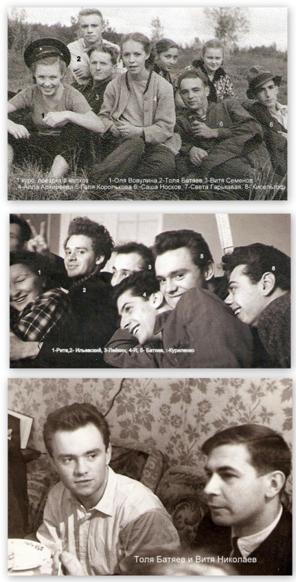 В институте Толя сошелся также с Витей Николаевым. Витя был достаточно странным парнем на фоне тогдашней молодежи с ее однообразными взглядами. Он никак не вписывался в общую систему, да и, пожалуй, не стремился к этому. После первого курса группа летом была направлена на работу в колхоз. Что там произошло конкретно мне неизвестно. Я тогда с ними не учился. Во всяком случае, он отказался делать что-то, что делала вся группа, но это противоречило его убеждениям. Результатом всего явилось комсомольское собрание, на котором был поставлен вопрос об исключении Вити Николаева из комсомола. Конечно, закончилось это ничем, по-моему, порицанием, но надо было видеть, как толпа пытается расправиться с индивидуумом, отказавшим ей в общности взглядов.