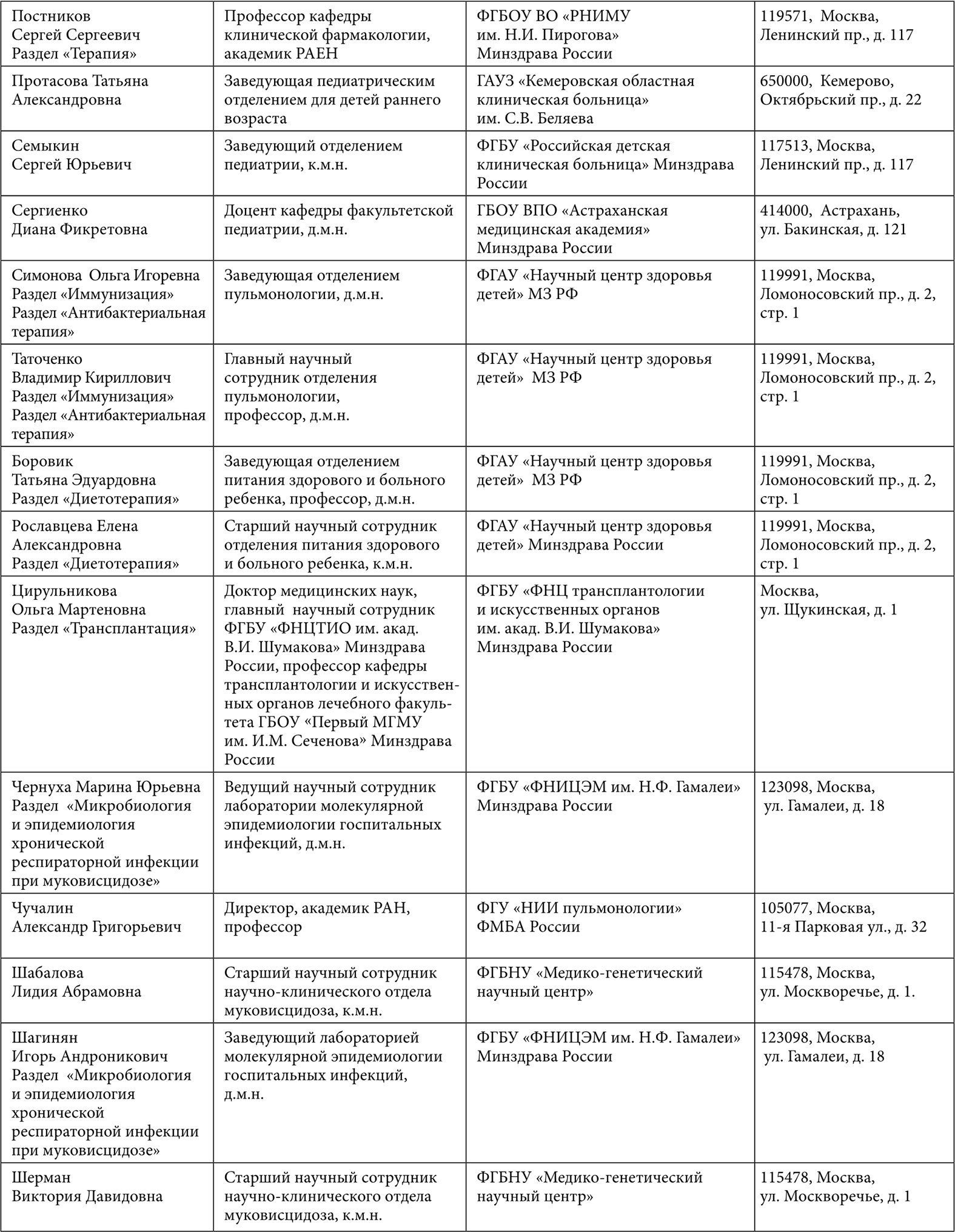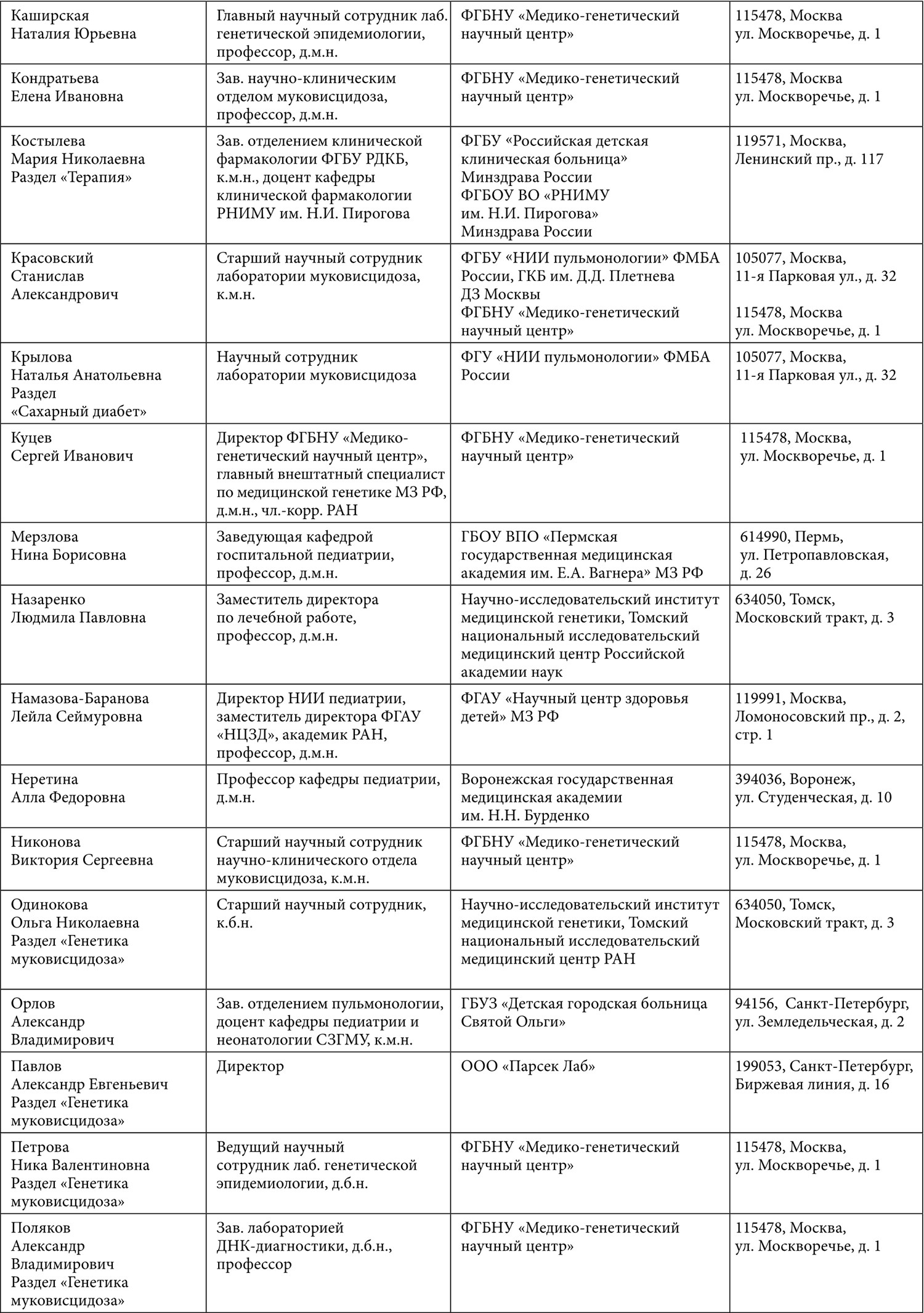 Координаторы проекта в лице проф. Е.И. Кондратьевой, проф. Н.Ю. Каширской, проф. Н.И. Капранова выражают искреннюю признательность всем членам экспертого совета за их высококвалифицированную и трудоемкую работу и надеются, что разработанный Консенсус будет полезен для повседневной деятельности как специалистов, вовлеченных в изучение проблемы муковисцидоза, так и широкого круга педиатров, терапевтов, генетиков, пульмонологов, гастроэнтерологов и других врачей, оказывающих практическую помощь больным данного контингента.