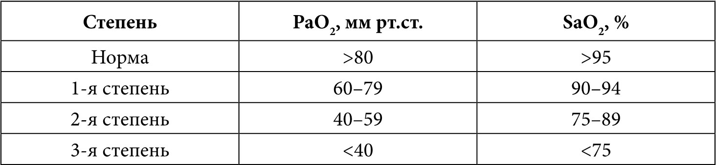** Степень дыхательной недостаточности устанавливается согласно «Классификации дыхательной недостаточности» (Национальное руководство по болезням органов дыхания, 2010). Степень тяжести заболевания рекомендуется не указывать исходя из первично-хронического течения, полиорганного поражения и прогредиентного течения.