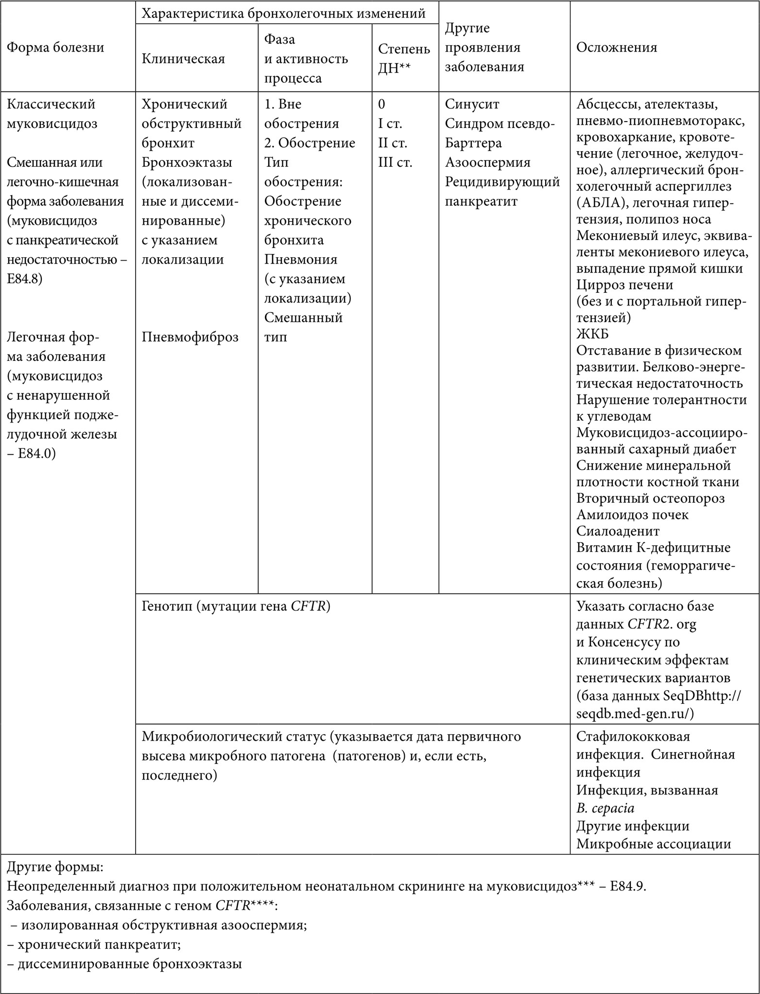 С учетом накопленного в стране опыта по классификации заболевания (Рабочая классификация муковисцидоза (Рачинский С.В., Капранов Н.И., 2000) и рекомендаций ВОЗ и Европейской ассоциации муковисцидоза, а также положений Приказа Минтруда России от 05.07.2016 № 346н «О внесении изменений в классификации и критерии, используемые при осуществлении медико-социальной экспертизы граждан федеральными государственными учреждениями медико-социальной экспертизы, утвержденные Приказом Министерства труда и социальной защиты Российской Федерации от 17 декабря 2015 г. № 1024н» (зарегистрирован в Минюсте России 28.07.2016 г. № 43018), рекомендовано использовать дополнительные показатели для формулировки диагноза (Таблица «Клиническая классификация муковисцидоза»).