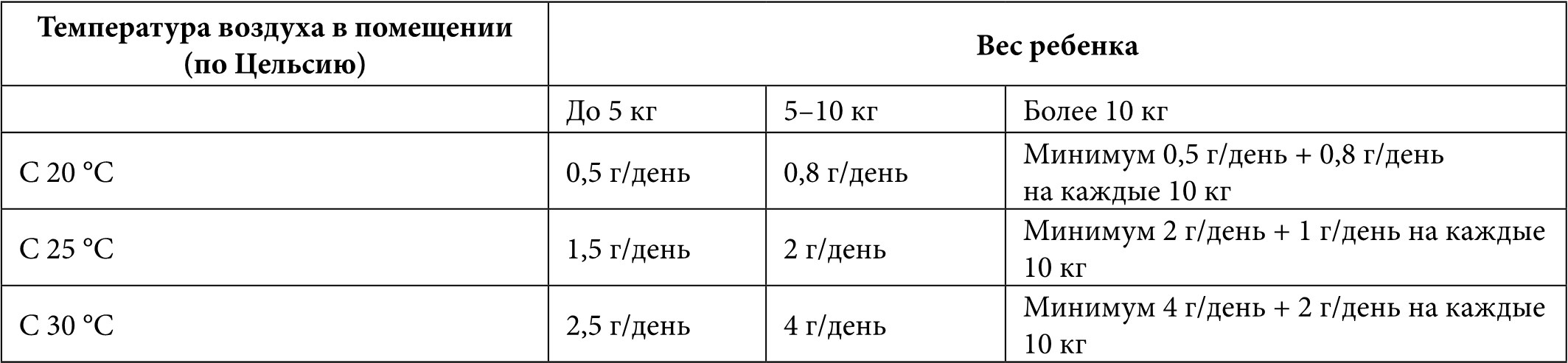 Старшим детям и взрослым рекомендуется подсаливание пищи по вкусу (солонка на столе). Дополнительное количество соли для детей раннего возраста зависит от веса ребенка и температуры окружающей среды (Табл. 3). Соль (хлорид натрия) может использоваться для подсаливания блюд прикорма или выпаиваться в виде физиологического раствора, раствора Рингера, между кормлениями. У маленьких детей нежелательно использовать для оральной регидратации глюкозосодержащие растворы (Оралит, Регидрон), так как они могут привести к снижению аппетита.