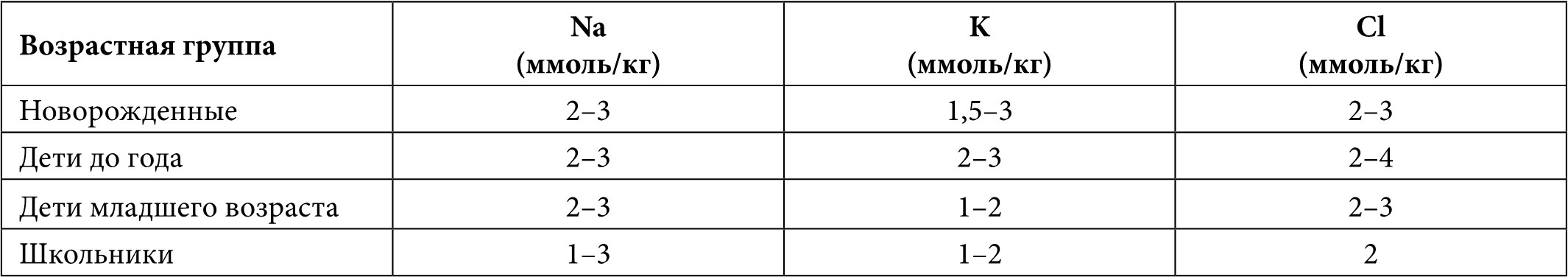 • при рвоте – 20 мл/кг (с 1 л желудочного сока теряется 50–100 ммоль натрия, 10–20 ммоль калия и 100 ммоль хлора);