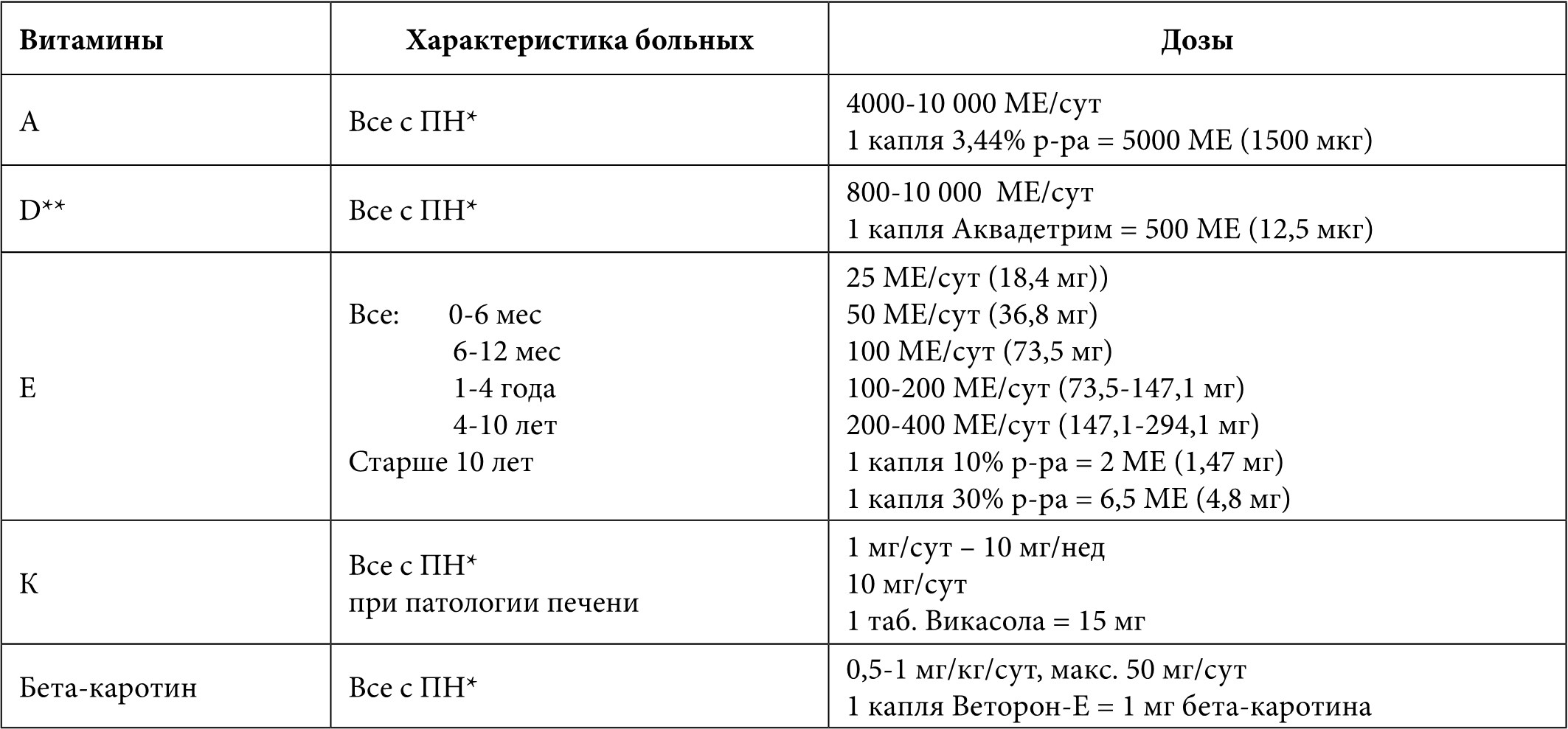 Таблица 6. Рекомендуемые дозы жирорастворимых витаминов и бета-каротина для больных МВ [14]