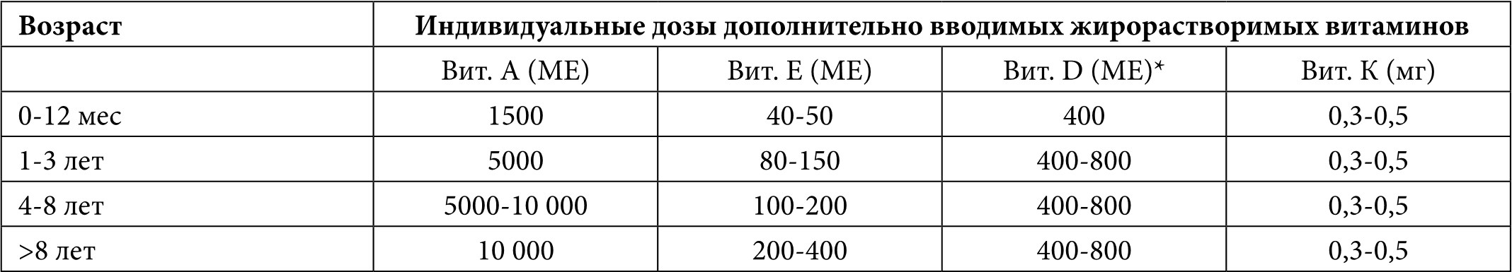 Таблица 7. Рекомендации по дополнительному введению жирорастворимых витаминов пациентам с МВ [21]