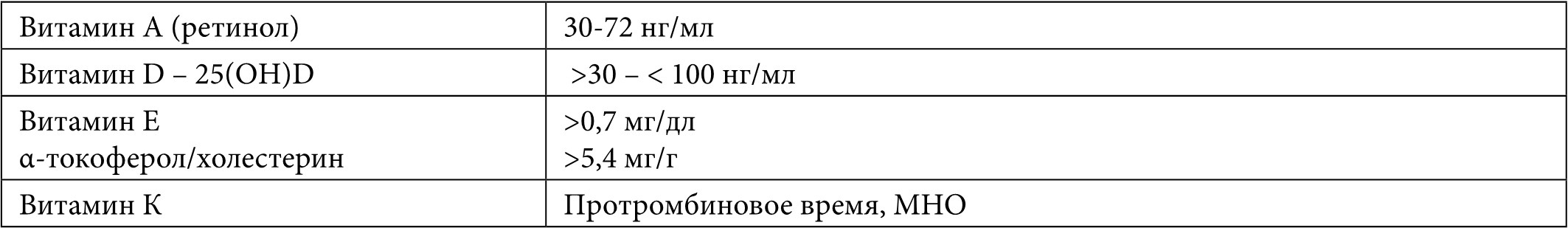 Рекомендуется проведение ежегодного контроля содержания жирорастворимых витаминов в сыворотке крови [7] (Табл. 8).