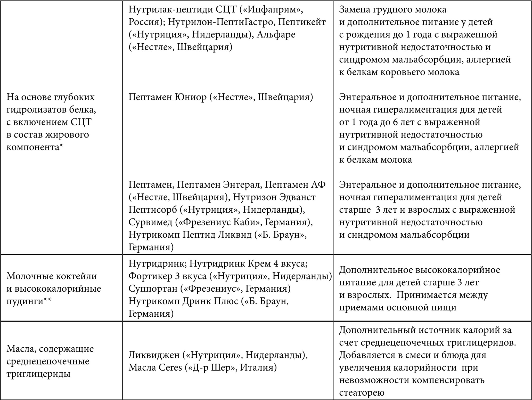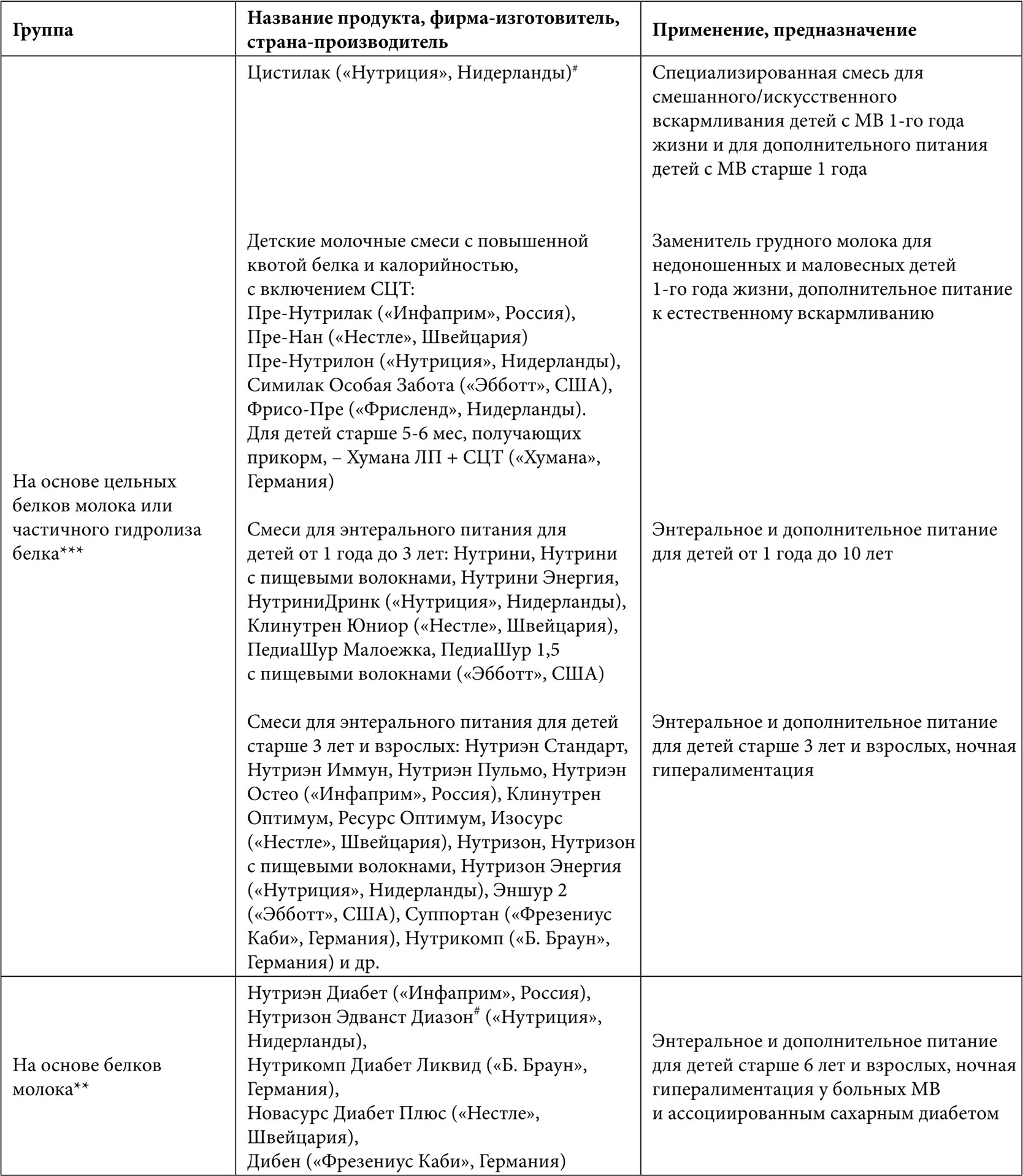 Таблица 9. Продукты и смеси для лечебного питания для больных муковисцидозом различного возраста (перечислены продукты и смеси, зарегистрированные и доступные на российском рынке)