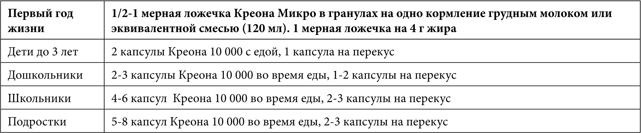 Таблица 1. Средние начальные дозы панкреатических ферментов с учетом возраста [8, 25]