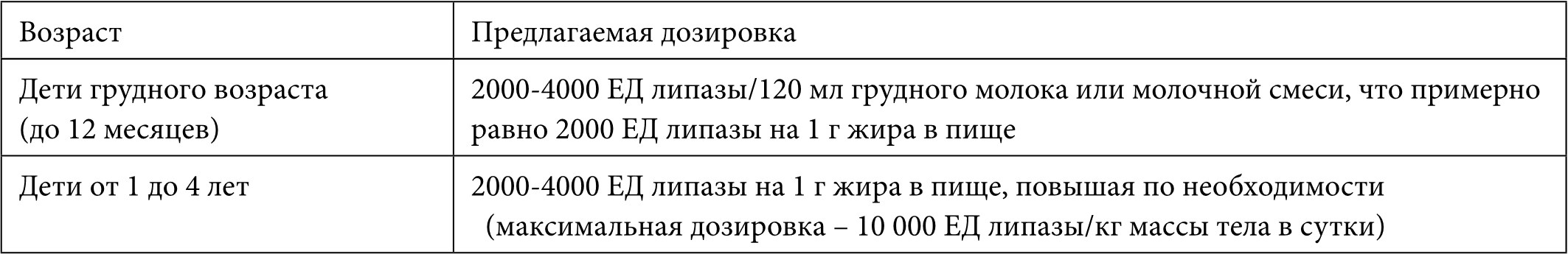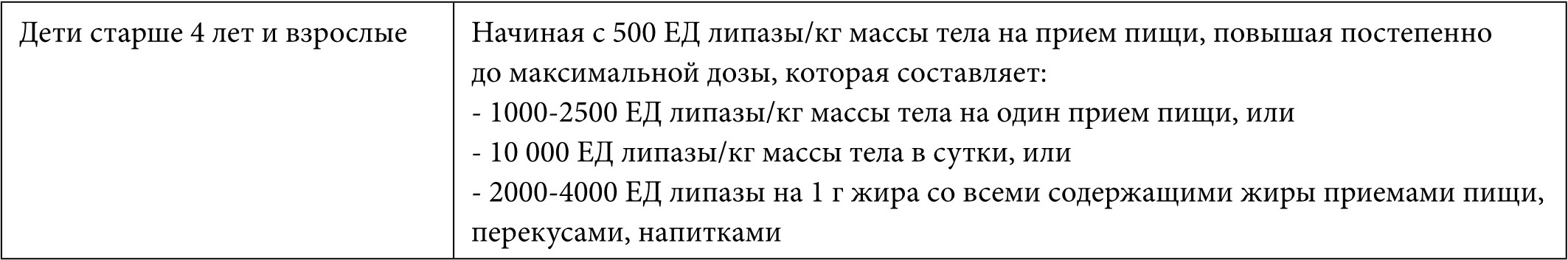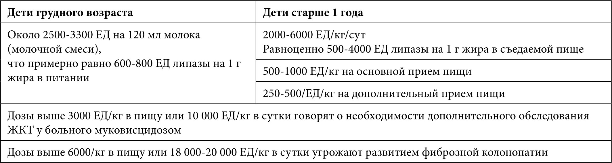 В только что вышедших Общеевропейских рекомендациях гастроэнтерологов, гепатологов и общества муковисцидоза (ESPEN-ESPGHAN-ECFS) представлена следующая схема дозирования панкреатических ферментов (Табл. 3) [13]. Таблица 3. Заместительная панкреатическая терапия, рассчитанная по содержанию липазы [9, 16, 20]
