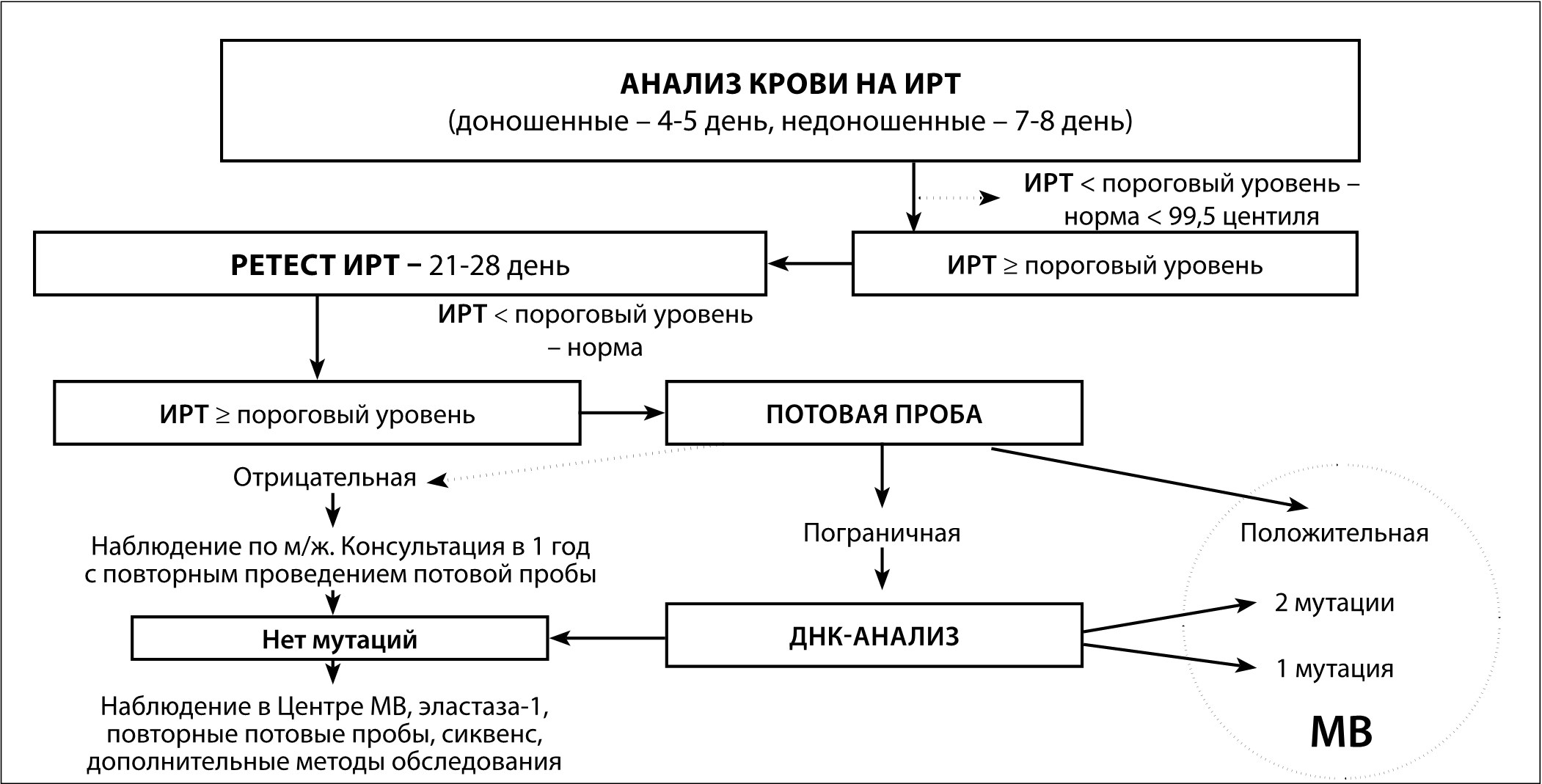 Наряду с МВ существует целый ряд патологических состояний, при которых могут иметь место гипертрипсиногенемия, а именно почечная недостаточность, внутриутробная инфекция, атрезия кишечника, несахарный почечный диабет, трисомия 13-й и 18-й пар хромосом. С определенной частотой повышение ИРТ отмечается у новорожденных североафриканского и афро-американского происхождения, а также у носителей мутаций в гене CFTR [32-33]. Минимальная положительная прогнозирующая величина (PPV-positive predictive value), т.е. число детей с истинно положительным результатом скрининга по отношению к общему числу положительных результатов, должна составлять 0,3 [6].