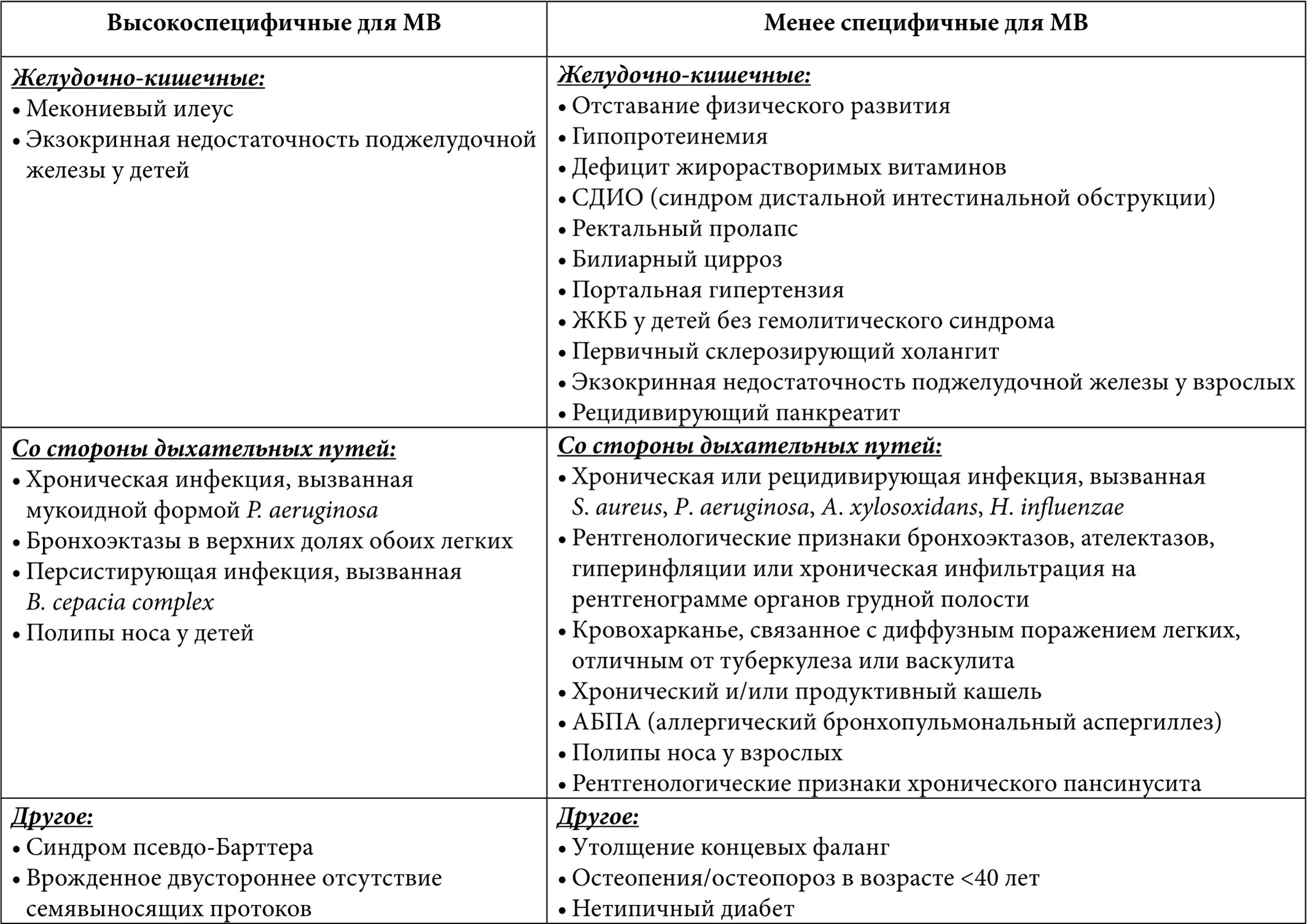 Среди клинических проявлений, характерных для МВ, можно выделить высокоспецифичные и менее специфичные (Табл. 4). Состояния, представленные в левой колонке таблицы, в абсолютном большинстве случаев встречаются у больных МВ. Причиной состояний из правой колонки могут быть другие заболевания, например первичная цилиарная дискинезия, иммунодефицит и т.д.