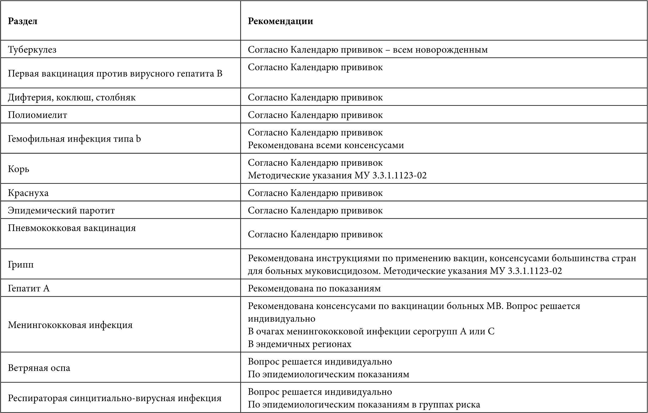 Заключение. Таким образом, дети с муковисцидозом в РФ должны вакцинироваться с помощью 12 вакцин и ежегодно против гриппа. По эпидемиологическим показаниям они могут быть привиты от гепатита А, менингококковой инфекции, ветряной оспы.