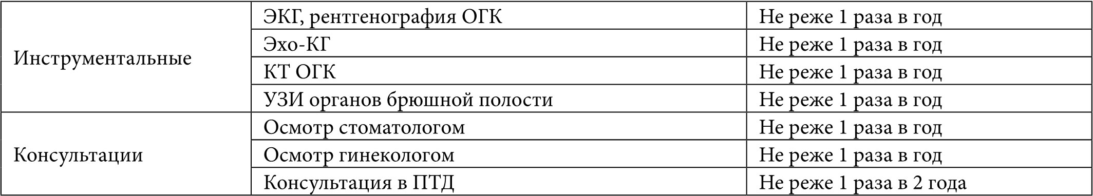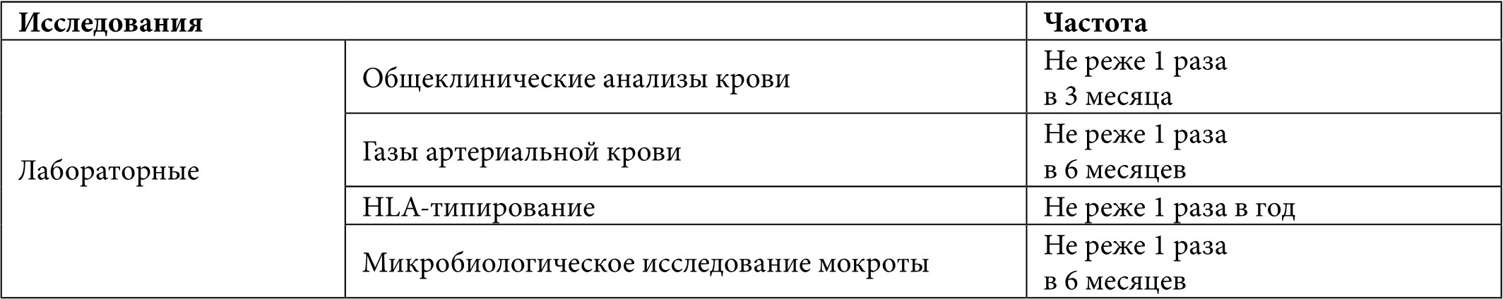 Во время регулярных обследований пациентов, находящихся в листе ожидания, выполняются объективный осмотр, общеклинические лабораторные анализы, инструментальные и дополнительные исследования по показаниям. В ходе динамического регулярного наблюдения реципиентов в листе ожидания особое внимание необходимо уделять признакам и маркерам прогрессирования дыхательной и/или сердечной недостаточности, изменениям нутритивного статуса, динамике изменения функционального состояния и толерантности к физическим нагрузкам, психоэмоциональному состоянию пациента. Кратность выполнения тех или иных исследований для пациентов в листе ожидания трансплантации легких представлена в Таблице 1.