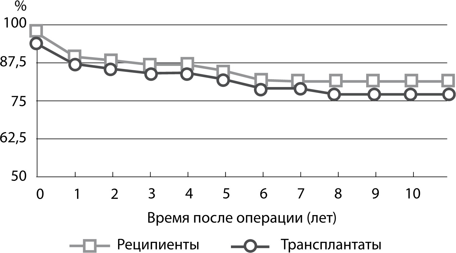 Рис. Актуариальная выживаемость трансплантатов и реципиентов печени
