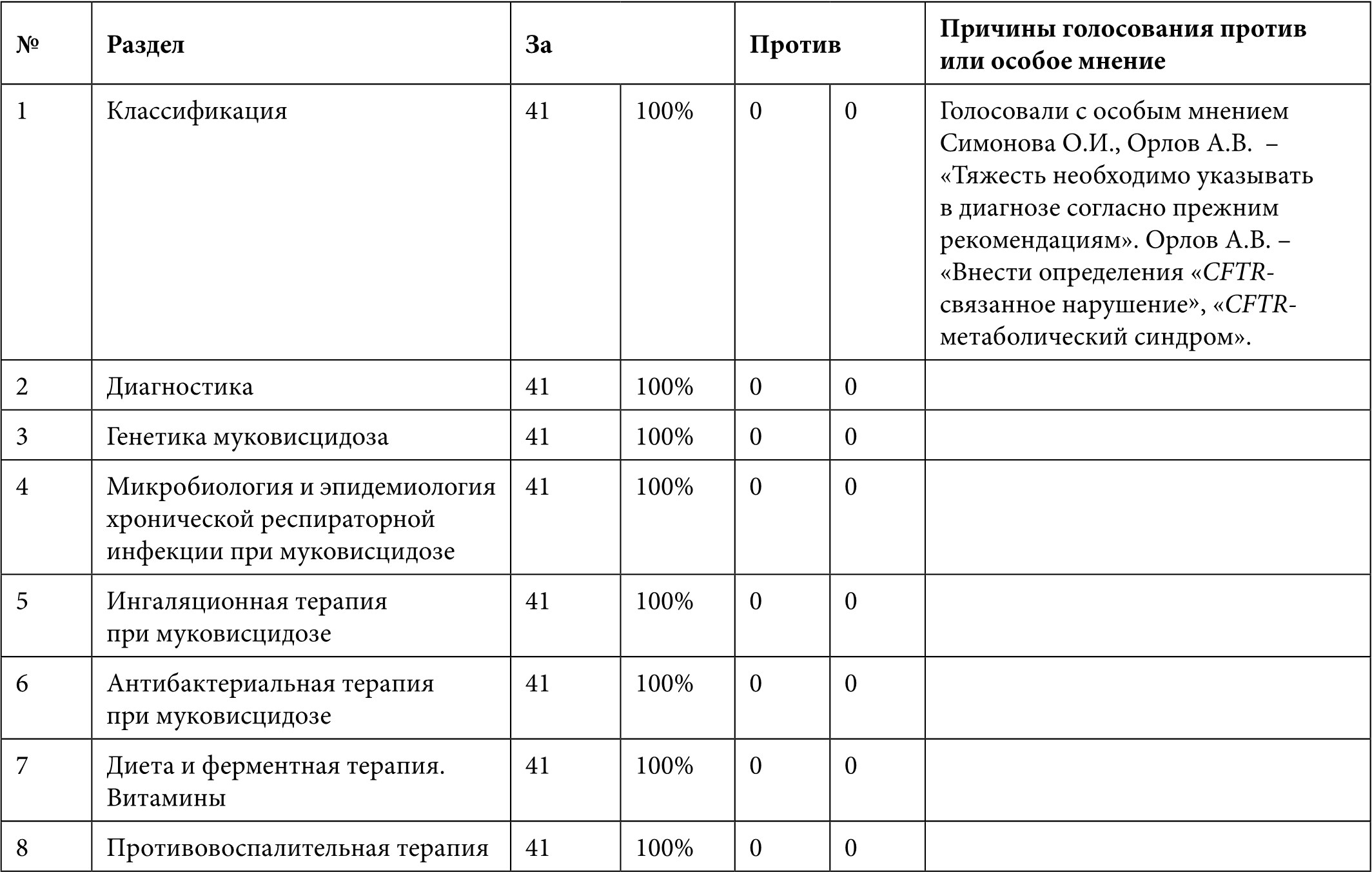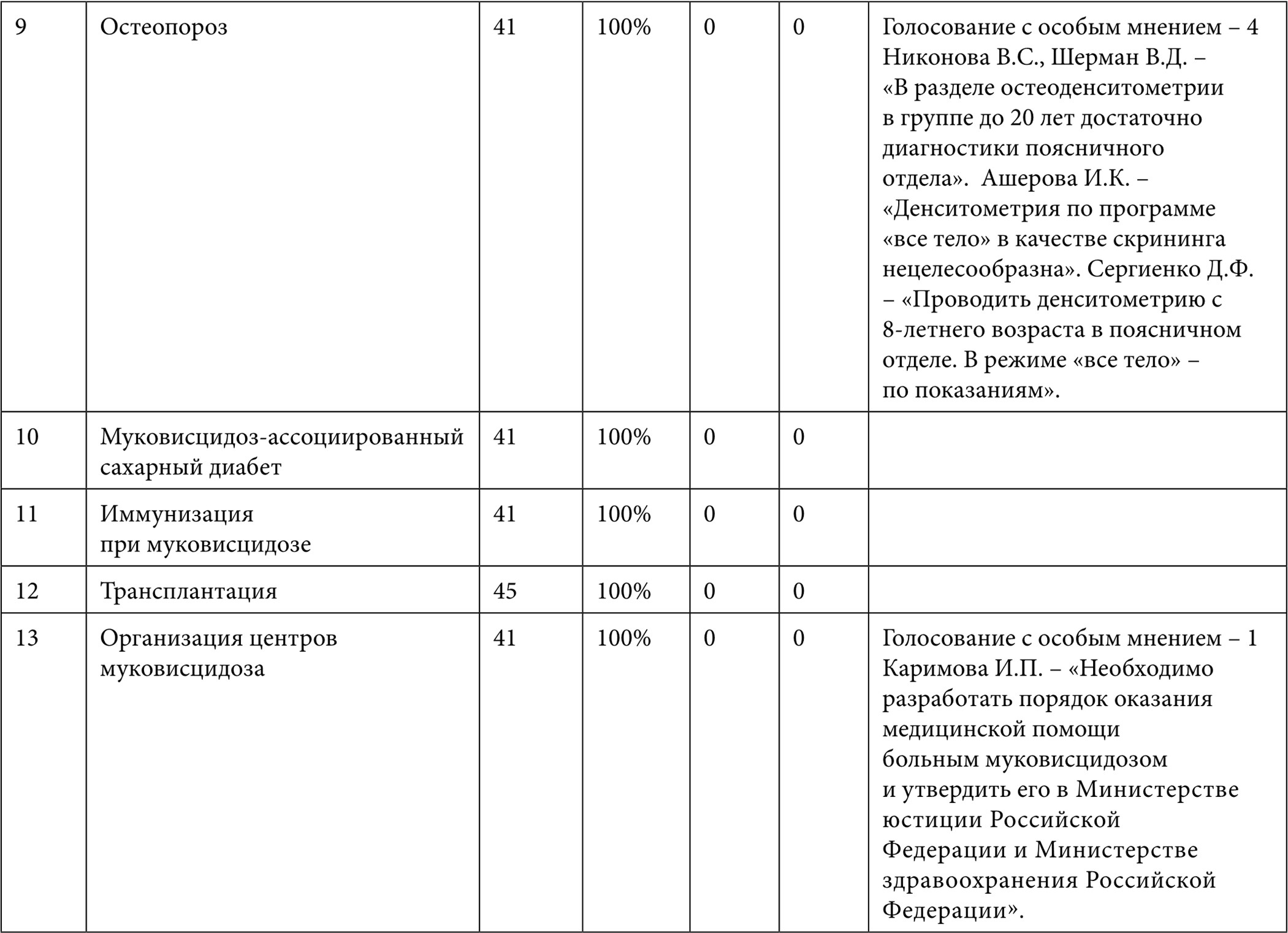 12. Кондратьеву Е.И. по разделу «Организация центров муковисцидоза». С предложениями выступили Каримова И.П., Красовский С.А., Никонова В.С., Воронкова А.Ю. Особое мнение при голосовании высказала Каримова И.П. – «Необходимо разработать порядок оказания медицинской помощи больным муковисцидозом и утвердить его в Министерстве юстиции Российской Федерации и Министерстве здравоохранения Российской Федерации». Решением участников Консенсуса в данный раздел внесены поправки с учетом обсуждения и особого мнения.