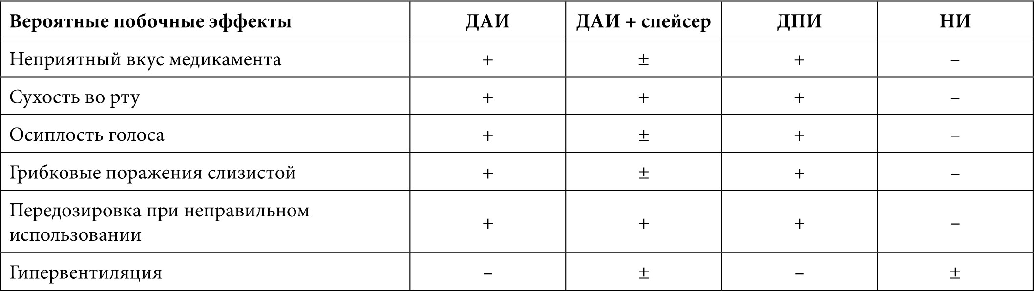 При назначении ингаляционных препаратов следует уделять внимание выбору средств доставки аэрозоля и технике проведения ингаляций, при этом необходимо учитывать вероятные побочные эффекты при применении тех или иных устройств (Табл. 1).