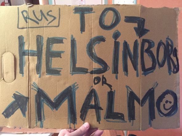 С собой у нас были предварительно заготовленные картонки с написанным на них маркером словом «Мальме».