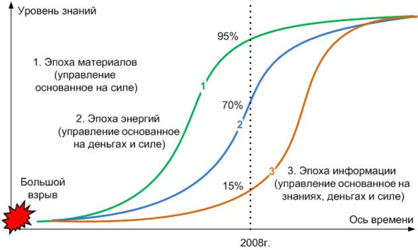 С конца 1960-х возрастает престиж образования, появляется целый слой квалифицированных специалистов, менеджеров, людей умственного труда. Общество уже обеспечено продовольствием и товарами, и на первый план выдвигаются различные услуги, в основном связанные с накоплением и распространением знаний. «Знание, – пишет Э. Тоффлер, – становится определяющим фактором в большинстве сфер деятельности, в том числе и в управлении. Если сила является основанием развития доиндустриальной эпохи материалов, деньги – индустриальной эпохи энергий, то знание – современного постиндустриального общества». В своей работе «Три волны» Э. Тоффлер показывает, что общество в настоящее время научилось социальному управлению через силу – на 95%, через финансы – на 70% и с помощью знаний – на 15%.