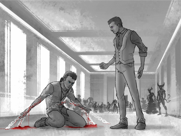 Адриан поставил пустой бокал на поднос подошедшей проекции и снял жилет, после чего бросил его ей же. Все демоны разошлись, образуя место для боя. Оркестр начал более резкую, накаляющую нависшую атмосферу игру.